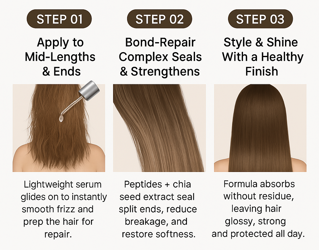 Bond-Repair Peptides + Cuticle Sealers work together to instantly smooth and seal split ends, giving your hair a fresh-cut look without losing length.