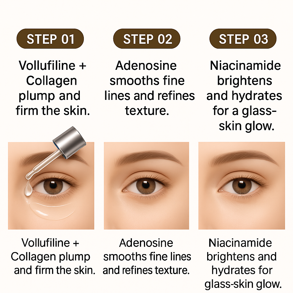 Plumps & firms skin → Vollufiline + collagen help restore elasticity and bounce.